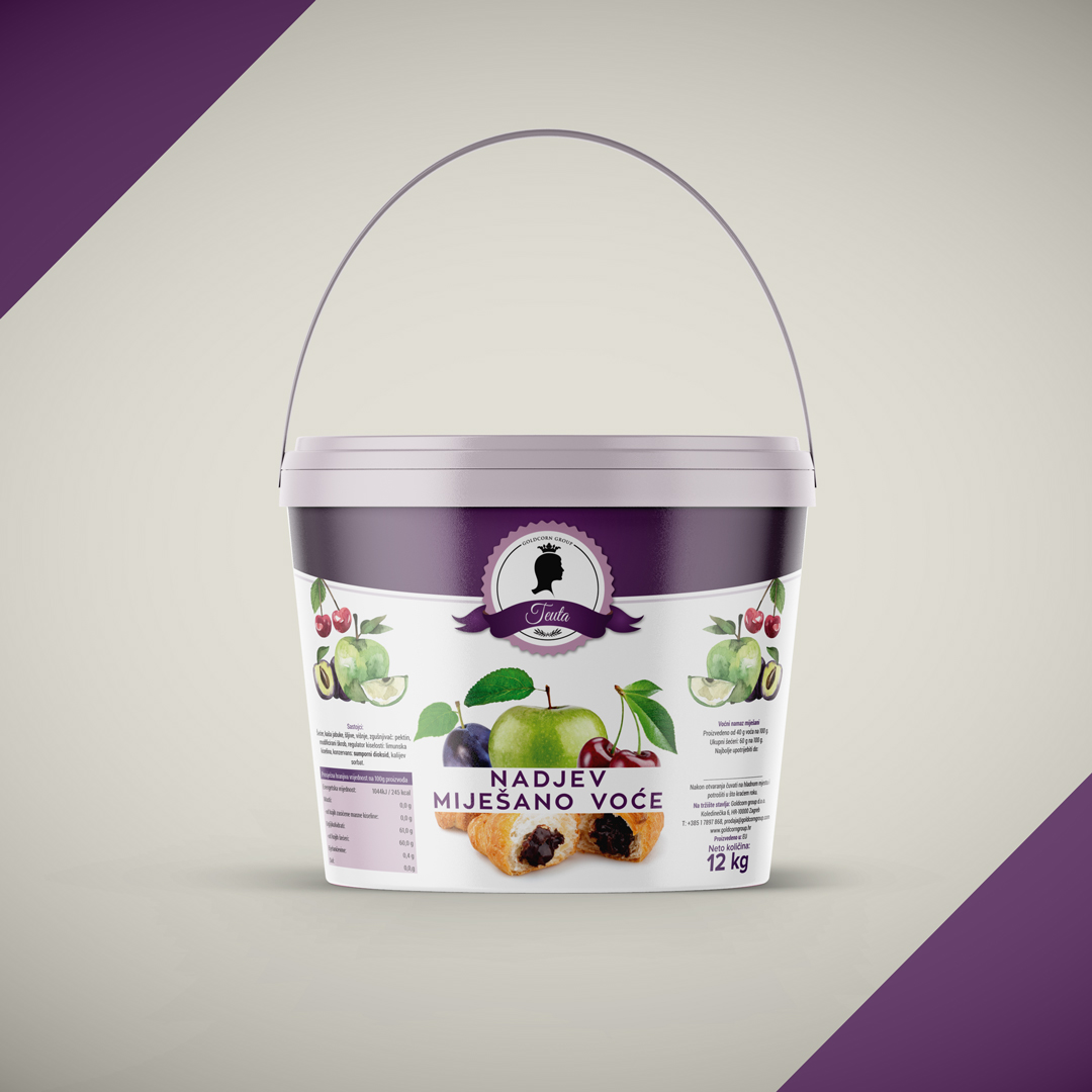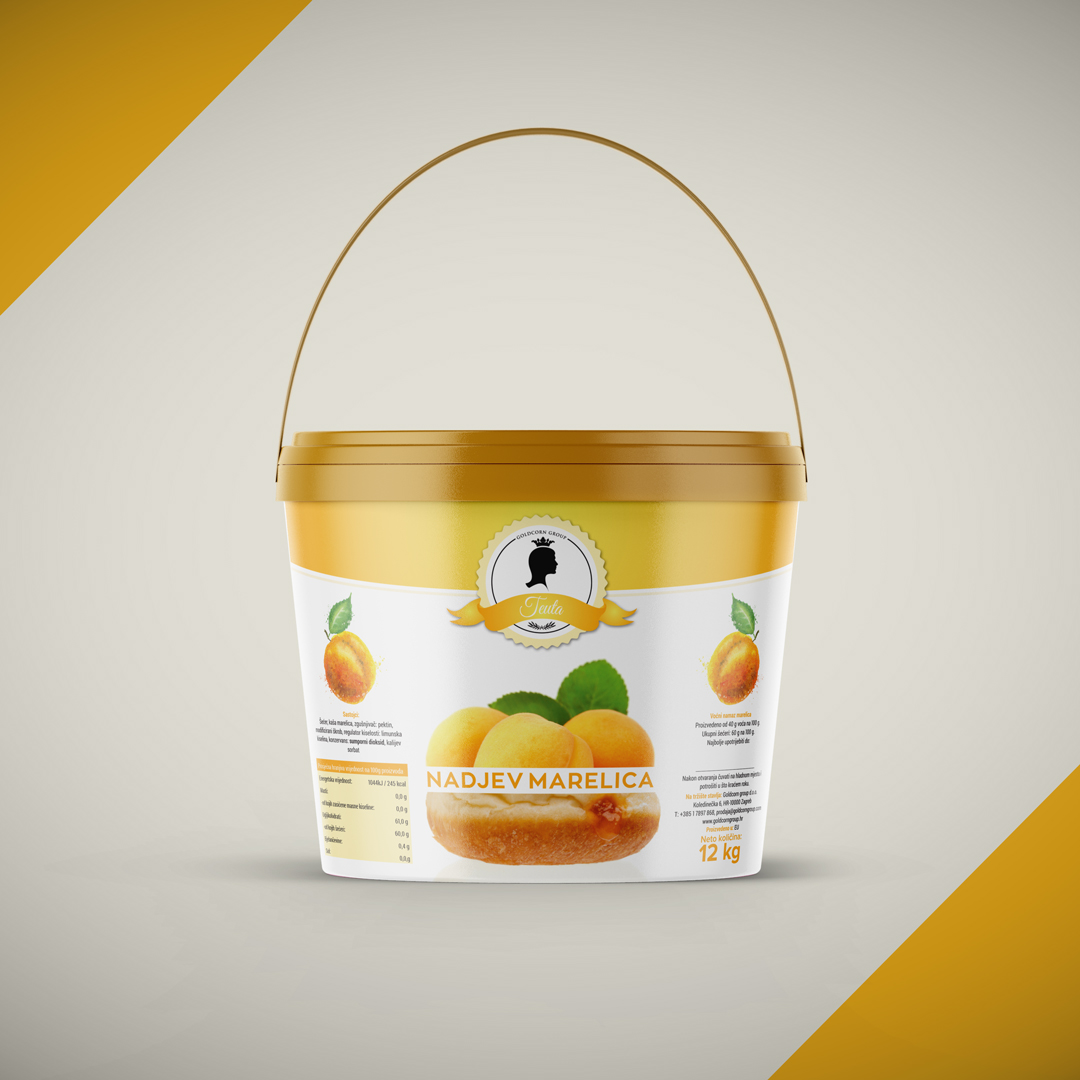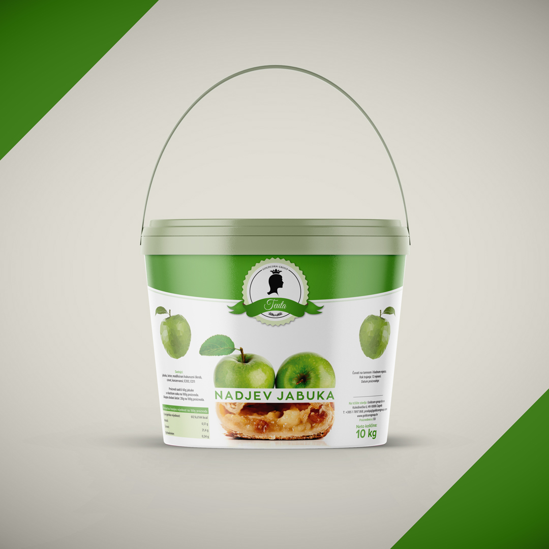 Za tvrtku Goldcorn iz Zagreba smo dizajnirali etikete na već postojeću ambalažu. Goldcornu je glavna djelatnost distribucija prehrambenih proizvoda mnogim proizvođačima diljem regije. U ovom slučaju su trebali dizajn za nadjeve u svojoj ponudi. Pošto se radilo o pet vrsta nadjeva (okusi: jabuka, čokolada (goldella), miješano voće, marelica i višnja) trebalo je osmisliti krovni dizajn za svih pet nadjeva te zatim svaki zasebno prilagoditi pojedinom okusu. To smo postigli sa promjenama boja i fotografija kako bi svaki okus bio lako prepoznatljiv.