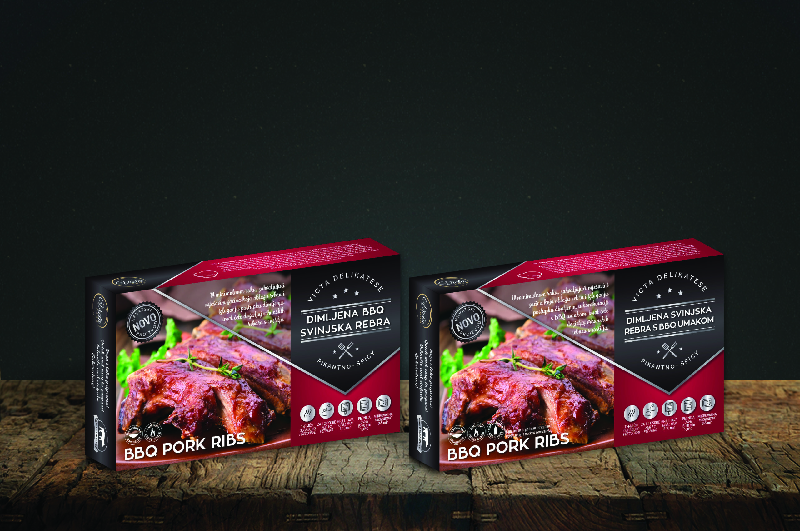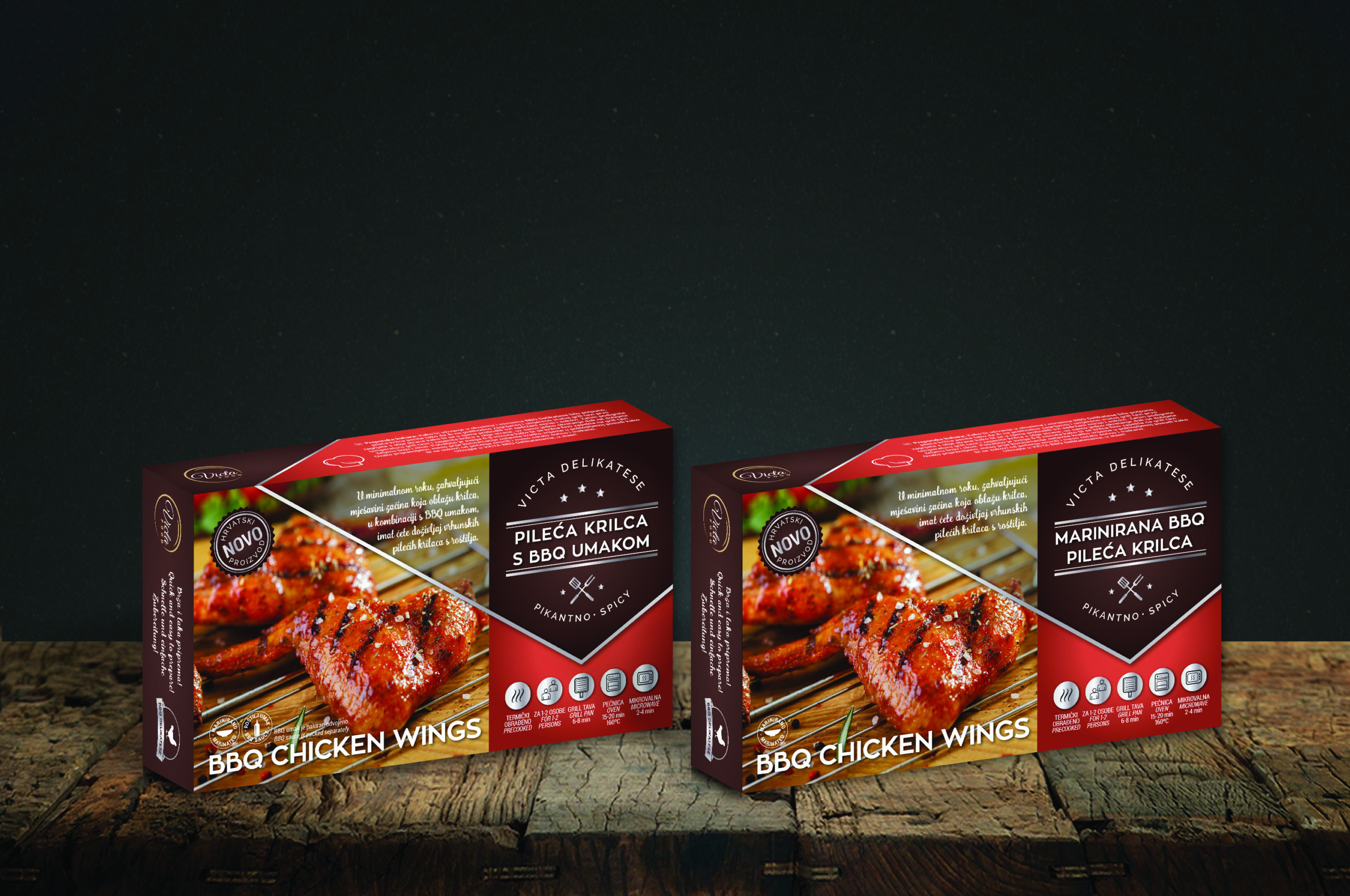 Za tvrtku Victa Food iz Karlovca smo dizajnirali ambalažu za njihove proizvode. Victa Food se bavi proizvodnjom mesa i mesnih proizvoda, te su razvili nove polugotove mesne proizvode za koje im je bio potreban dizajn. Kreirali smo ambalažu za 4 proizvoda koje je povezivao jednak krovni dizajn, ali se pakiranje razlikovalo po boji, tekstu i fotografiji.