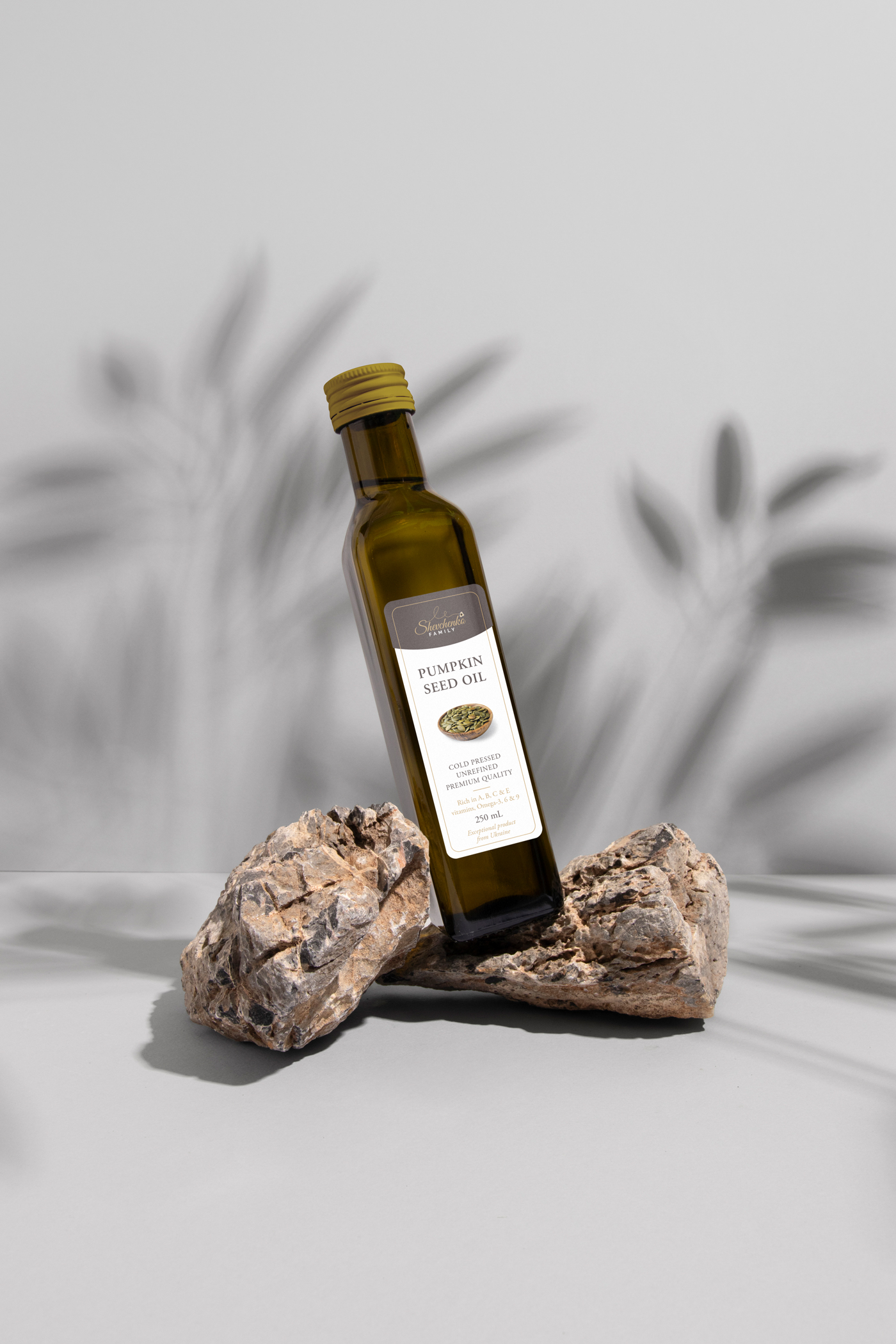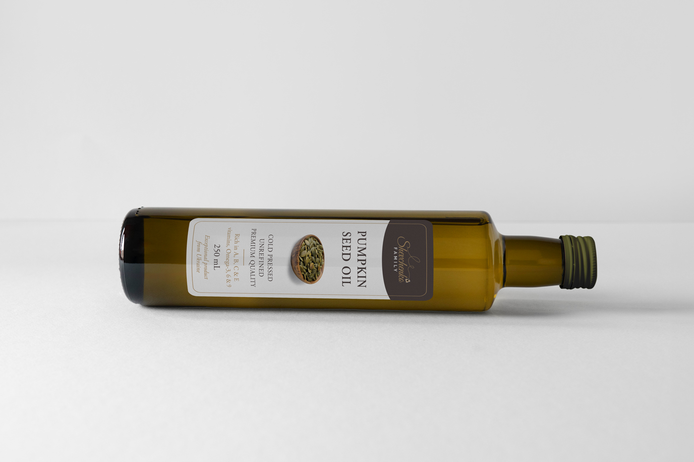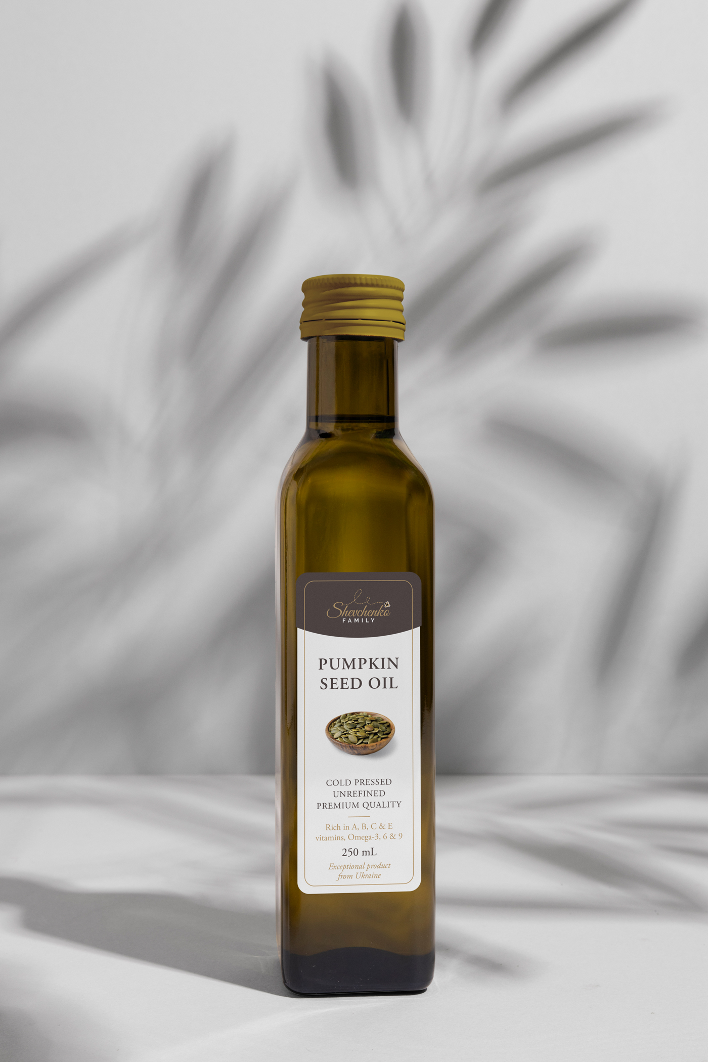 Rad na izradi etikete za Shevchenko bio je zanimljiv projekt koji je omogućio suradnju s malim obrtnicima na početku njihovog puta u proizvodnji ulja od oraha i bučinih sjemenki. Jednostavan i moderan dizajn etikete, s bijelom pozadinom, jasnim tekstom, ilustracijom bundeve ili oraha, sivim logom u obliku bannera i zlatnim detaljima, omogućuje jasnu komunikaciju vrijednosti i kvalitete proizvoda.